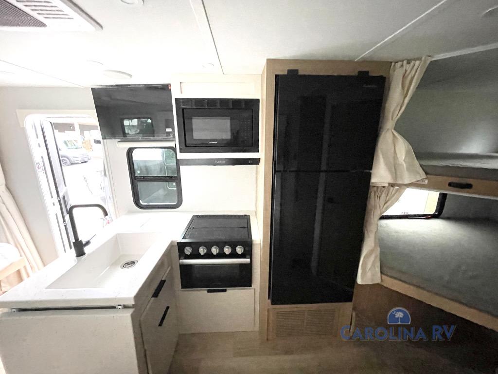 If you enjoy camping with a larger group, this travel trailer with double-size bunks is sure to be a fit! There is also a U-shaped dinette within a slide for more sleeping space, and you'll find the front king-size Murphy bed to be very versatile. A recessed three burner cooktop with an oven will let you make meals each day, and the 10.6 cu. ft. 12V refrigerator will keep your cold items fresh. There is also a countertop extension, giving you more space to prep meals. The full bath includes a power vent fan and a shower skylight that will give you additional lighting and extra head room as you get ready each day!