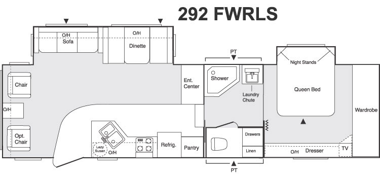 Sofa, Dinette, Ent. Center, Lazy Susan, Double Sink, 3 Range top, Refrigerator, Pantry, Laundry Chute, Shower, Pass-Through Storage, Queen Bed, Night Stands and Much More!