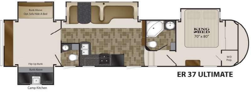 Heartland ElkRidge FW w/Rear Bunk Slideout, Slideout Flip Up Bunk w/Bunk Above Camp Kitchen Including: Refrig., Sink & Stove Top, 1/2 Bath w/Private Entry Including Sink & Linen, Versa Table & Sofa w/Twin Recliners Slideout, Ent. Center, Refrig., 3 Burner Range, Dbl. Kitchen Sink w/Overhead Storage, Step Up to Side Aisle Bath w/Angle Shower, Toilet & Sink w/Linen Cabinet, Door to Front Bedroom w/King Bed Slide w/Upgraded Pillow-top Mattress, Ward. w/Sliding Doors, W/D Prep, & More!