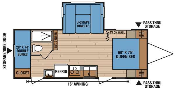 Single Slide Spree Travel Trailer, Closet, Bunk Beds, Toilet, Shower, Entertainment Center, U-Shape Dinette Slide, TV On Wall, Dbl. Wardrobes, Queen Bed, Dbl. Kitchen Sink, 3-Burner Range, Refrigerator, Lav., Overhead Cabinets Throughout, 16' Awning, Pass Thru Storage, Rear Storage/Bike Rack & Much More.