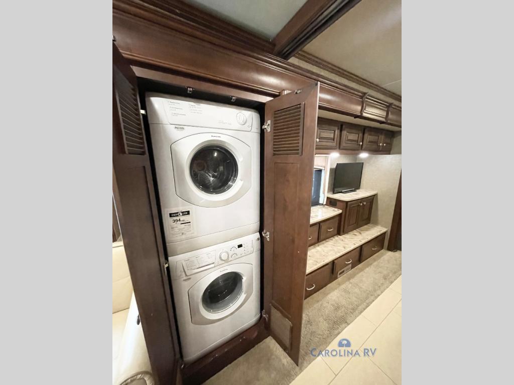 Beyond the dinette and sofa in the full wall slide there is a convenient washer and dryer.