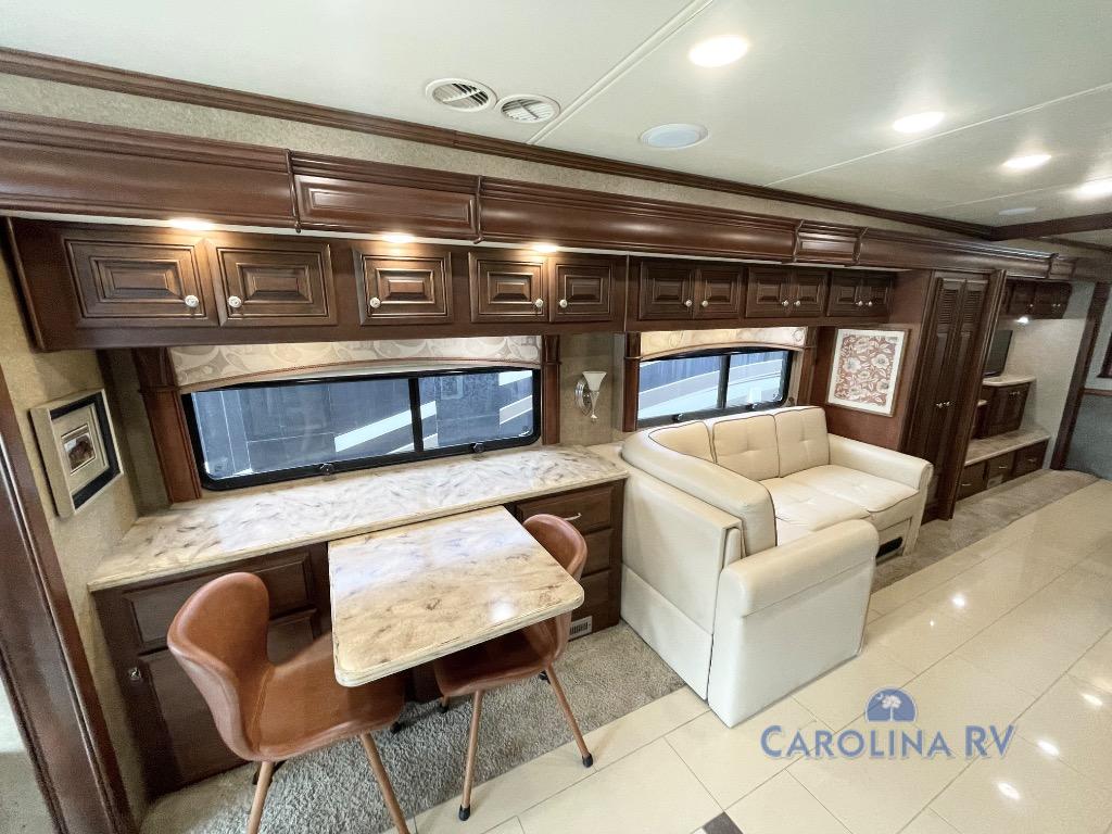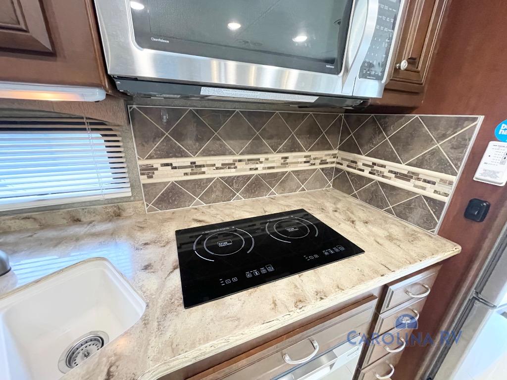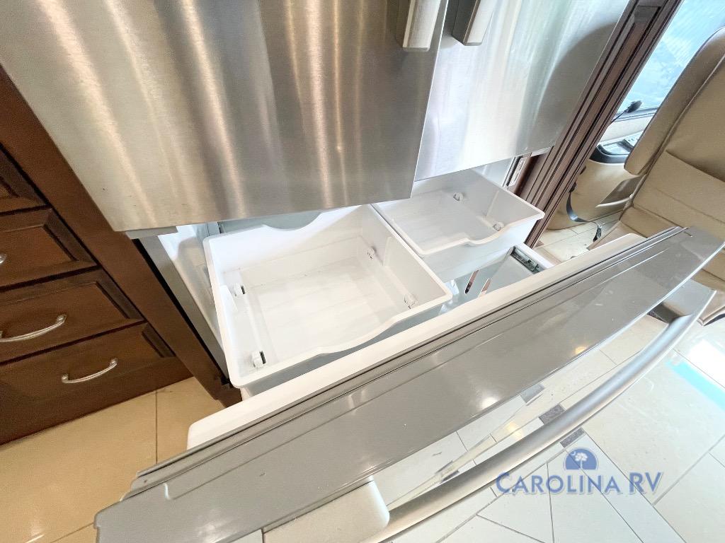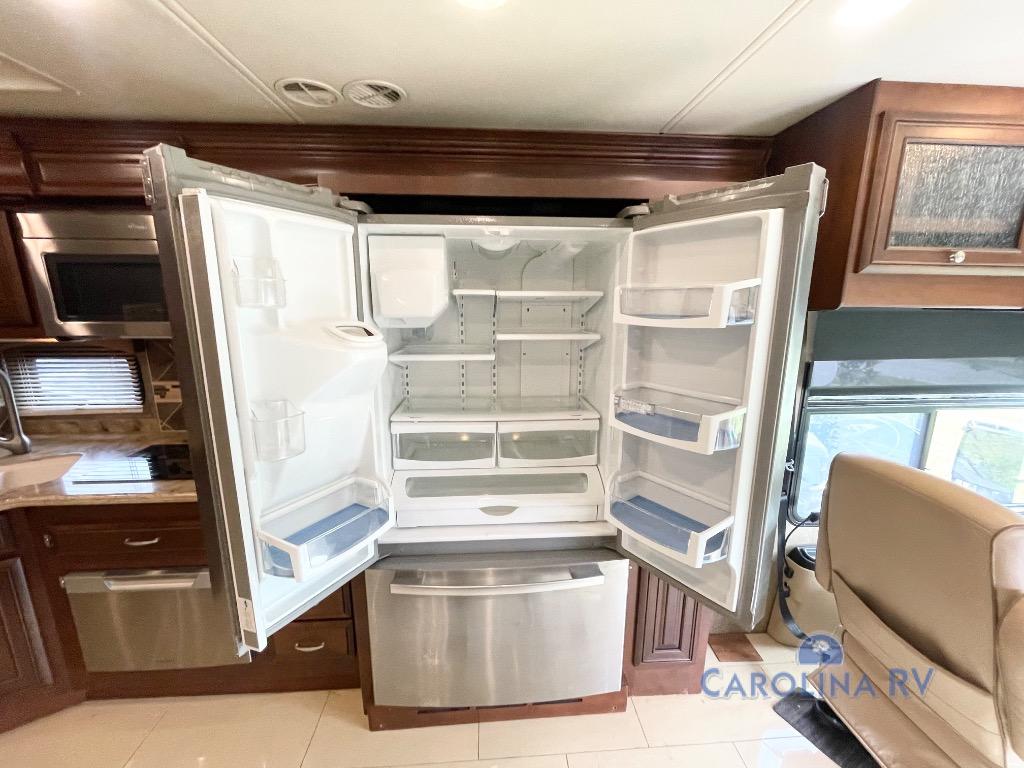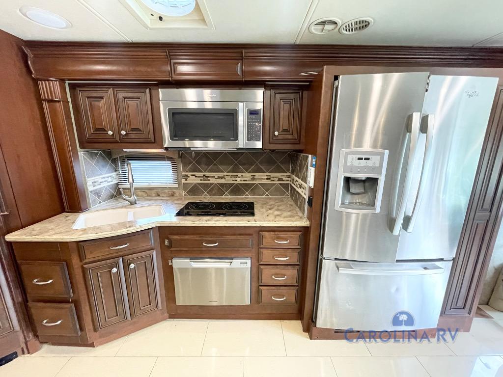 Enter model 40RX and find a spacious combined living area and kitchen starting right behind the driver and passenger seats. On the road side there is a slide-out pantry, French door residential refrigerator, two burner cook-top with microwave oven above, and a double kitchen sink, plus overhead storage cabinets too.