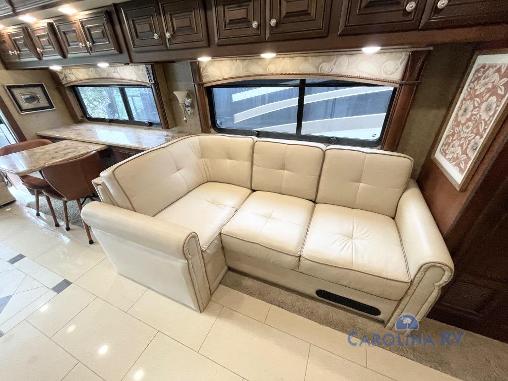 The large slide opposite is a full wall slide that features the living room furniture, as well as the bedroom chest of drawers and more. Starting up front there is a 74" buffet dinette and 84" expanding sofa with twin air bed for additional sleeping space when needed.