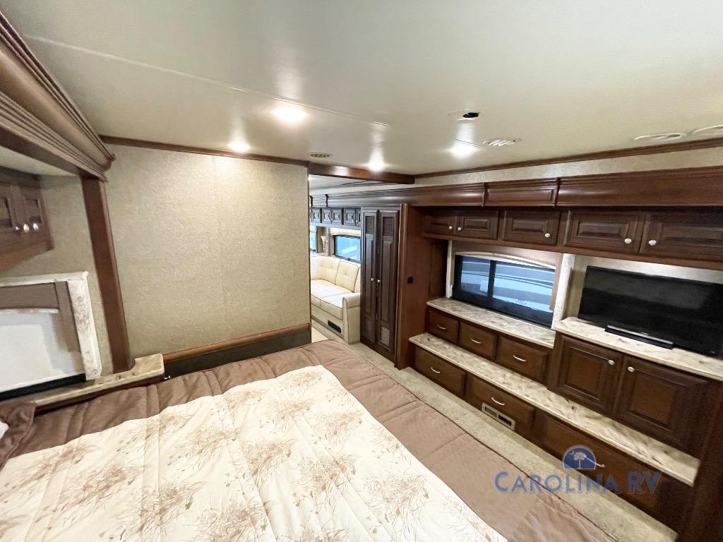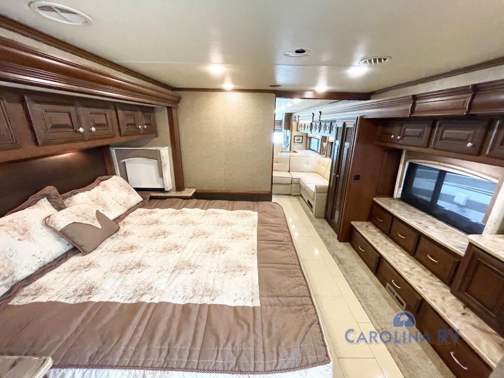 A sliding door leads into the rear bedroom and master bath. In the bedroom you will find a king size bed with nightstands, and a toilet and sink slide-out on your right. The left side finishes up the full wall slide with a chest of drawers and 32" HDTV for your enjoyment.