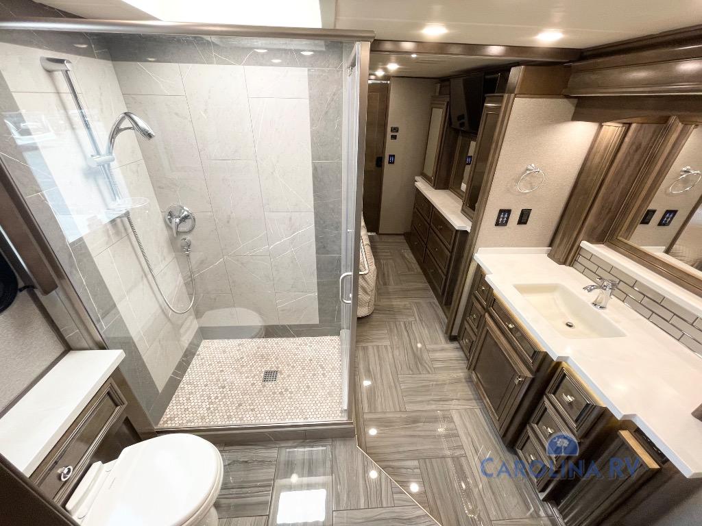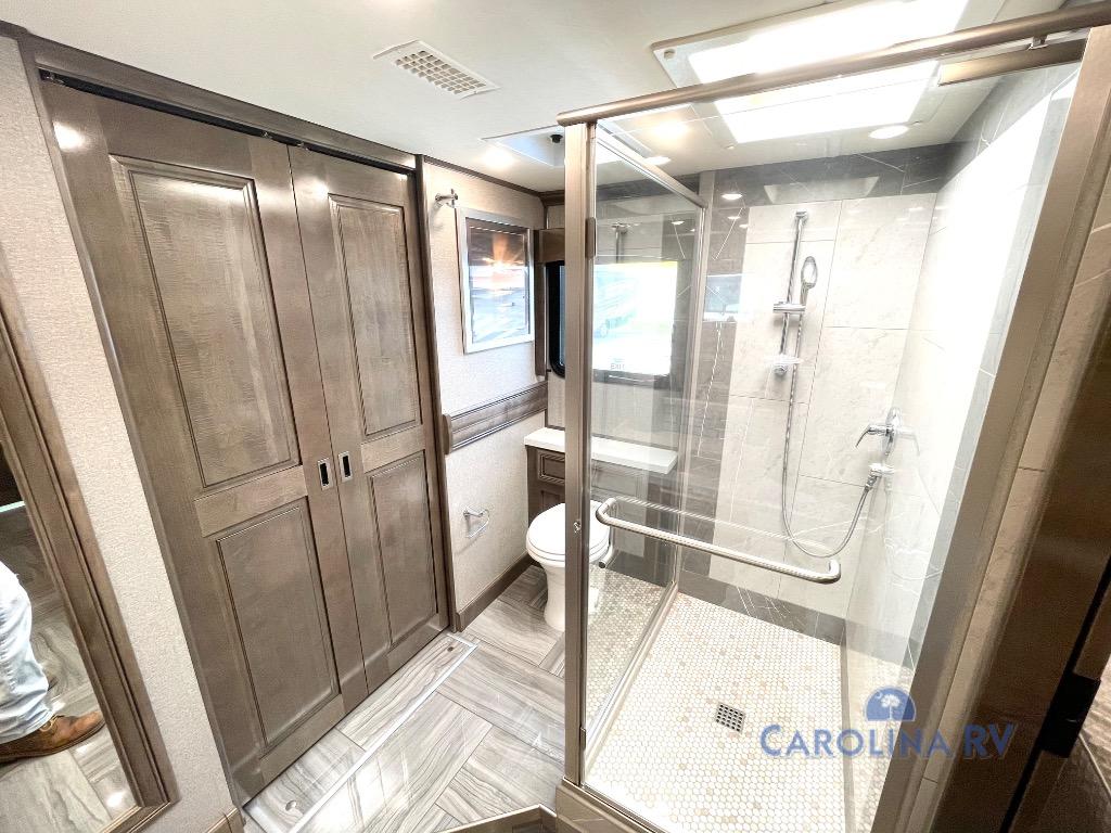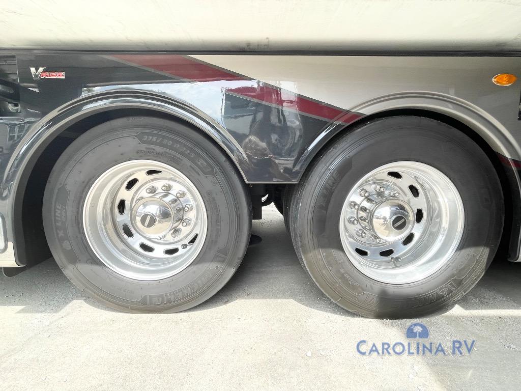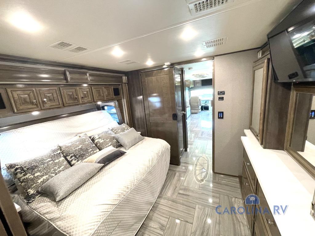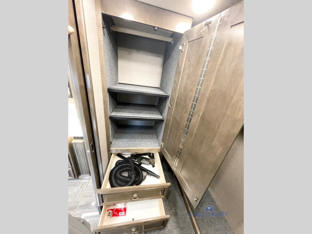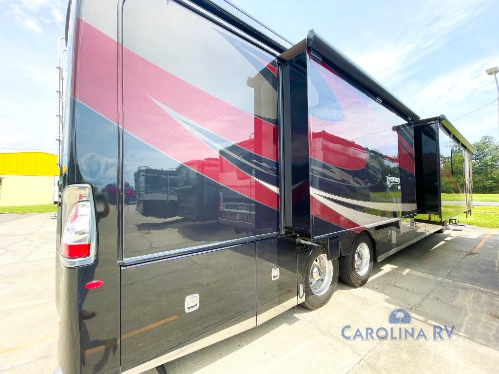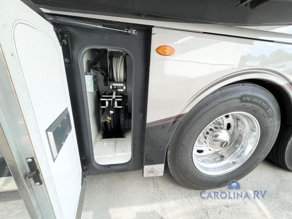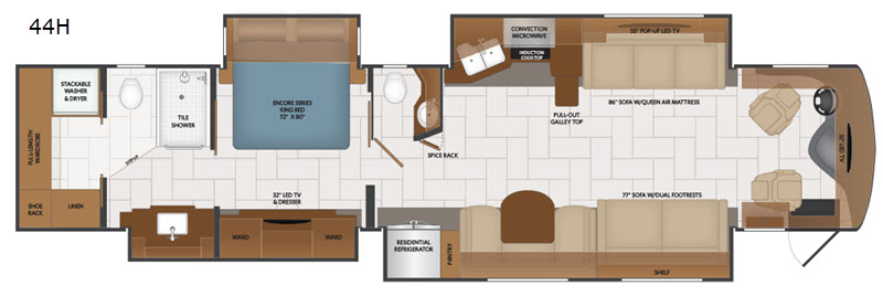 You can probably envision yourself and your family driving down the road on Ultra-Leather captain's chairs and on the furniture while enjoying the view out the windows of this diesel coach. Your grandkids are probably planning all their adventures once you get set up at the RV park. This unit offers a large closet in the full bathroom with a washer and dryer, linen storage, and a shoe rack, plus a full length wardrobe. You can enjoy your own Encore Series king bed while watching TV or even washing clothes in the side-by-side appliances. The half bath is conveniently mid-coach for those quick breaks, and there is plenty of furniture for relaxing, dining and extra sleeping space for the relatives. Don't forget about the outside 48" TV and electric awning when you want to enjoy the weather and watch the grandkids run around. You will find more features that provide luxury and convenience, step inside!