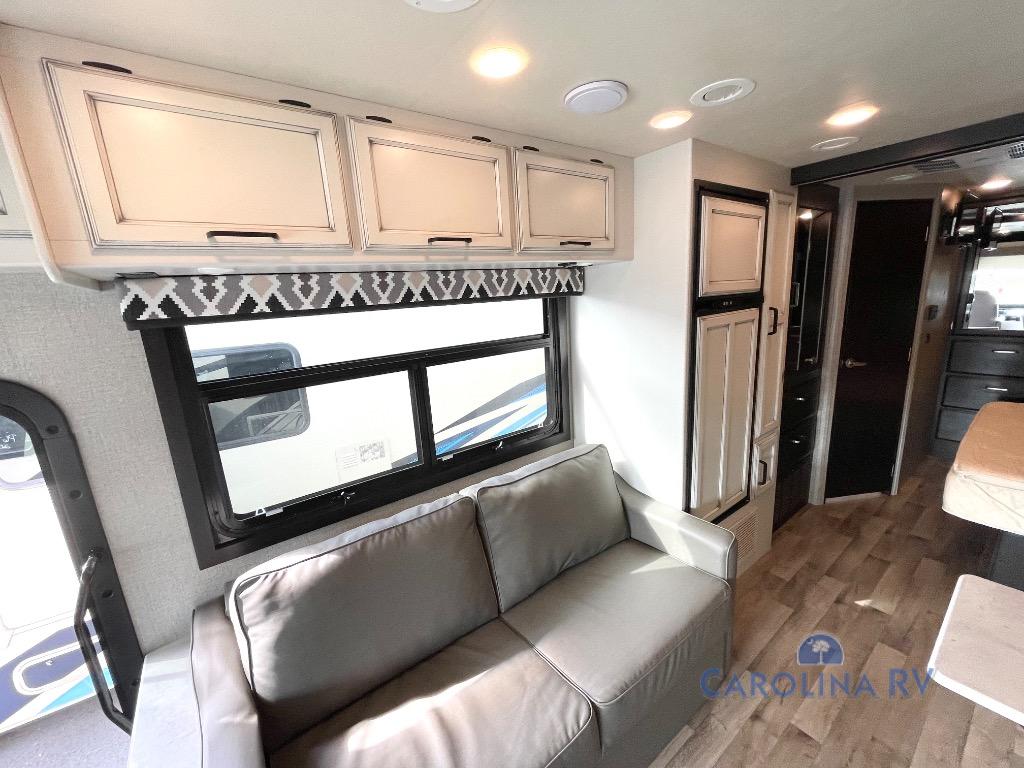Set your sights on this motorhome that includes two slides for more space and a rear corner bath for added privacy. Each day you can prepare meals on the three burner cooktop and leftovers can go in the 8 cu. ft. refrigerator. You also have the choice here to upgrade to a 12 cu. ft. fridge for more storing space. Play a game of cards with the kids at the booth dinette or relax on the jack-knife sofa and watch a movie on the 39" TV. In the evening, the kids can convert the furniture for sleeping space and mom and dad will enjoy the rear corner bedroom with a king bed and a large wardrobe for all their clothes. This model also includes an outside entertainment center and an 18' electric awning with LED lights for an outdoor living space.