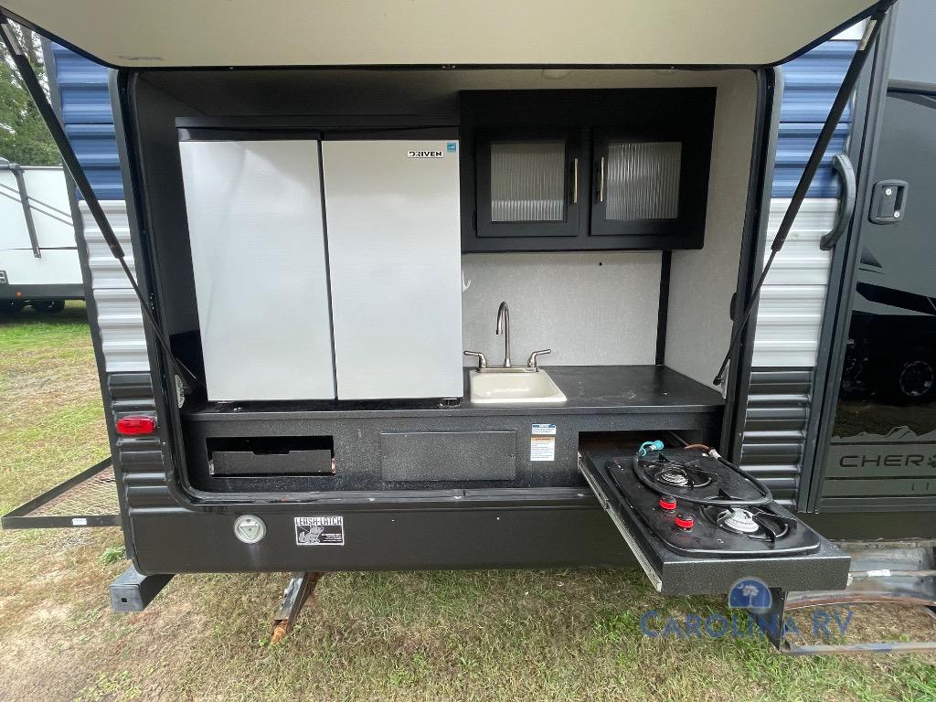 Answer the beckoning call with one of these Forest River Cherokee travel trailers or toy haulers! With a Power Gear™ frame technology, a premium wheel package, an armored underbelly tank enclosure, and seamless roofing membrane with heat reflectivity, you will enjoy a unit that will last through any adventure. The Chef Select black stainless steel kitchen suite package gives you the ability to prepare delicious home cooked meals even in the woods. The supersized, 15,000 BTU central air conditioning unit has a quick cool air dump feature to keep you cool even on the hottest summer days. You can also rinse off your feet before entering the unit with the outside shower with hot and cold water. Come take a look at all the other features!