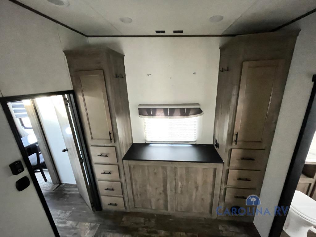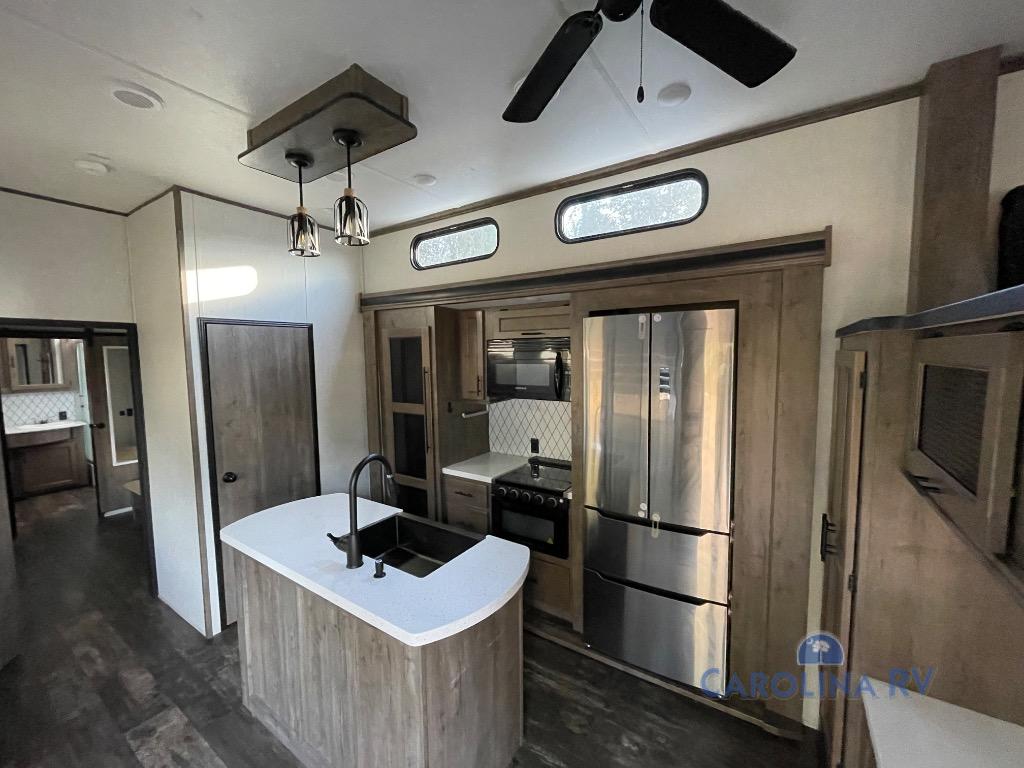 This Sabre fifth wheel with a full and half bath is sure to be a crowd pleaser! The front living area is the perfect place for everyone to visit each other comfortably on the two tri-fold sofas that can be transformed into extra sleeping spaces, or at the theater seating for complete relaxation. You will also find an entertainment center with a fireplace and a residential-size LED TV. This Sabre kitchen is packed out with convenient features, such as a residential refrigerator, a kitchen island, and a lighted pantry with motion sensors. The rear master suite has access to its very own full bathroom with a double-sink vanity for two to get ready at once and a wardrobe that is prepped for the optional washer and dryer to be added so that you can extend your vacation even longer with clean clothes!