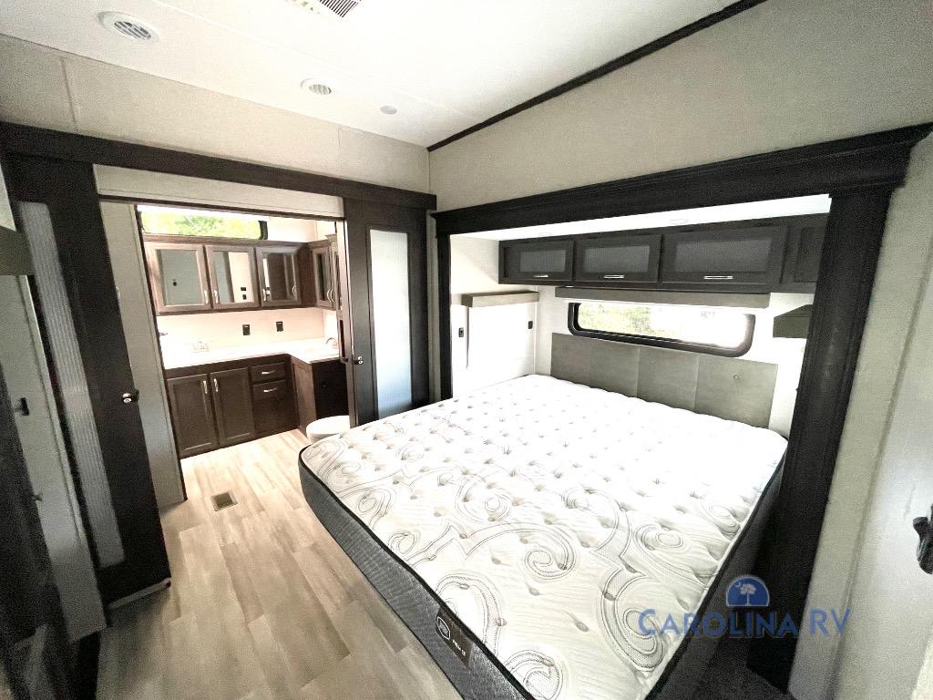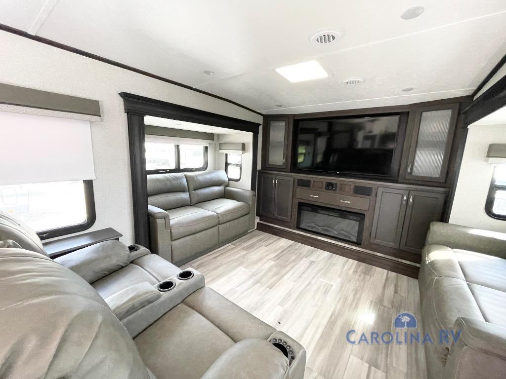 If you're looking for a luxury fifth wheel with more space and a larger sleeping capacity, you've found it! There are an impressive five slides, including dual opposing slides in the front living area and kitchen so you can really stretch out. Everyone will love to gather in the front living area on the two tri-fold sofas and theatre seating, and this room can become your guests' bedroom at night. The little ones will love to play a game at the free-standing table while the chef cooks dinner on the residential cooktop with a stainless steel oven. You'll also find a pantry here for dry goods and a residential refrigerator for perishables. The feature that really stands out in this model is the master suite, take a look! A queen bed slide can be optioned out for a king bed, and you'll have a dresser and a wardrobe for your clothes. The spacious full rear bath includes a large shower with a seat, a large dual sink vanity, and a wardrobe with washer and dryer prep. And we didn't even mention the outside refrigerator that will be perfect for cold drinks under the 14' power awning!