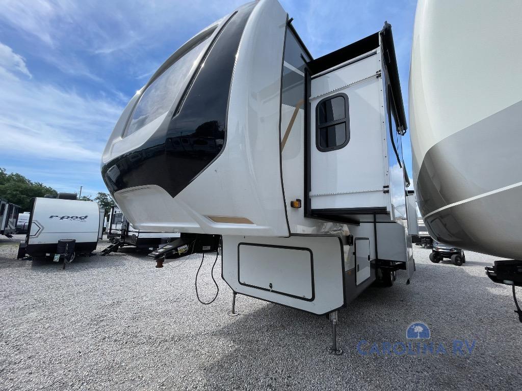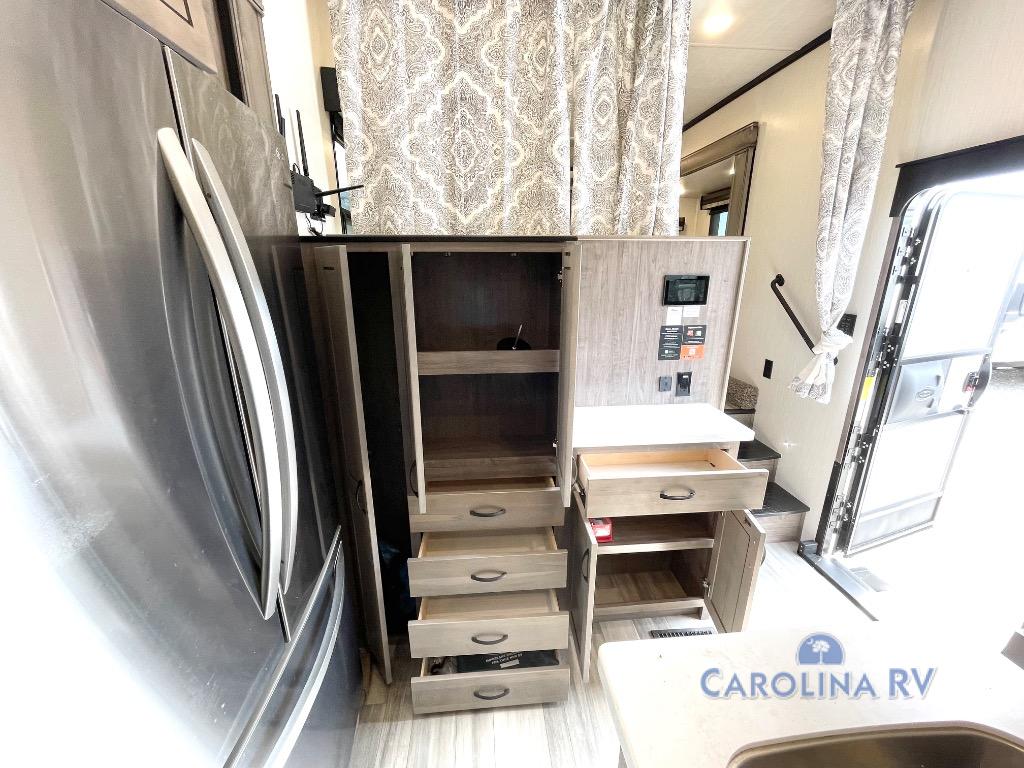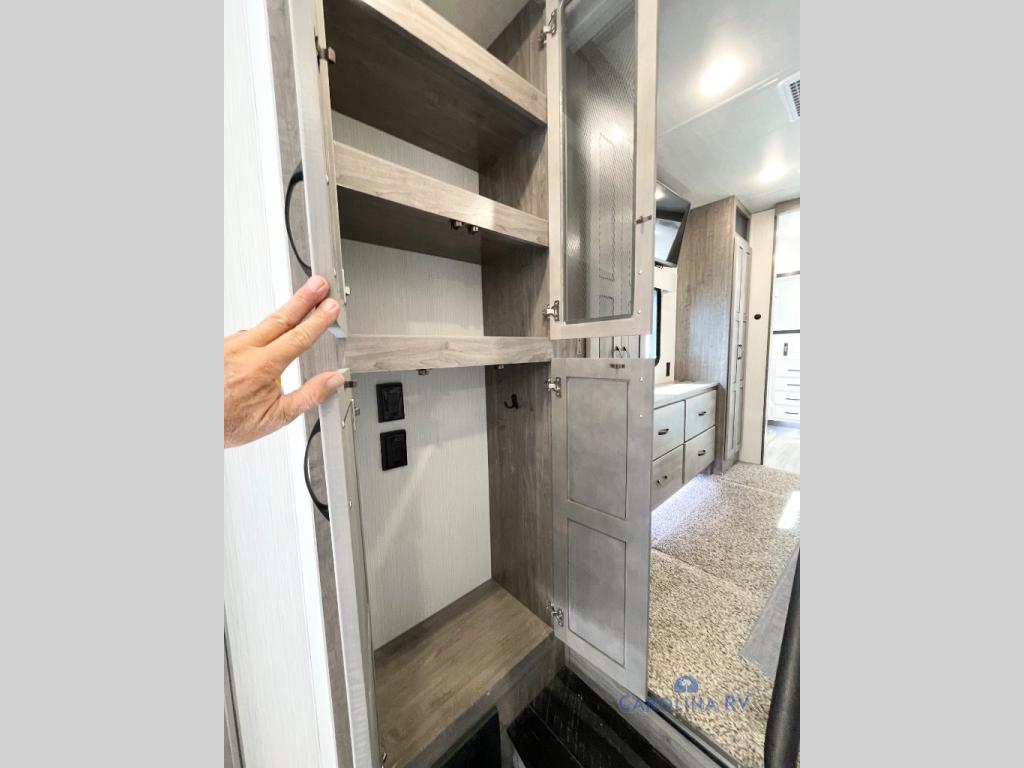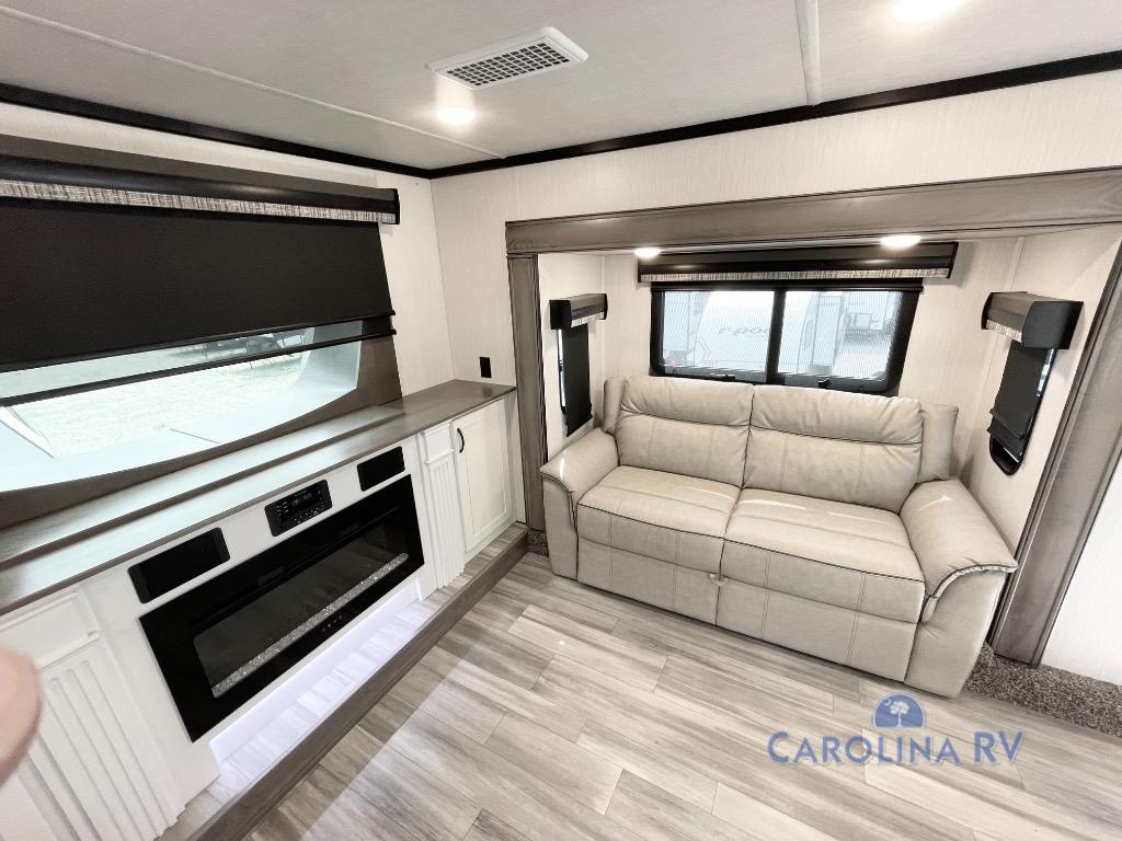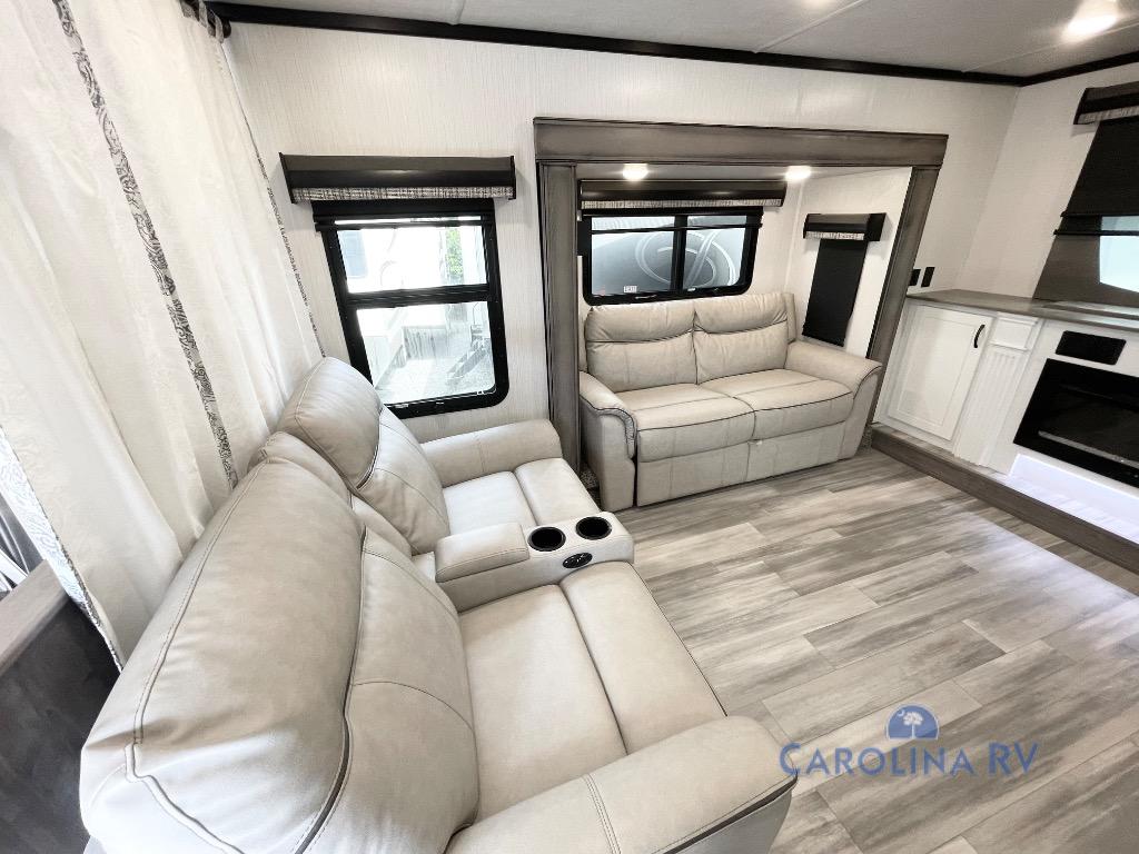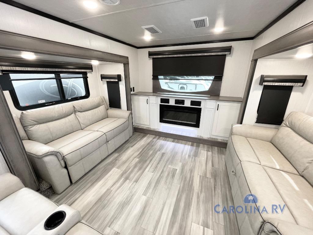 This fifth wheel has everything and then more! The front living area has opposing tri-fold sofas and power theater seating across from the front entertainment center with a fireplace and hidden telescope 50" flat screen TV to watch your favorite movies in comfort. The chef can prepare their best meals with the kitchen island, the free standing 24" gas range, and you can add the optional pantry with shelves to store more of your snacks and store your cleaning supplies in the broom closet, plus there is a half bathroom for your convenience. Enjoy your meals and the extra space provided with the free standing table slide. The master suite has a king bed slide to lay your head at night and access to the full rear bathroom which has a drop-down storage, a shower with a seat, a linen closet, a closet prepped to add an optional washer and dryer, and a dual sink vanity for two to get ready at once!