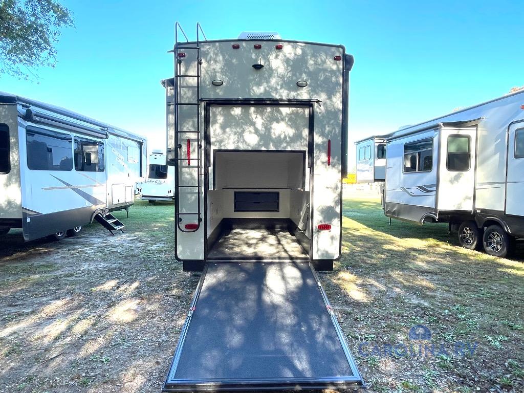 You can bring your favorite off-road toys with you to the campground in this fifth wheel toy hauler! Enjoy a good night's rest on the queen bed above the 63" x 110" below floor garage area, and your guests can sleep on one of the opposing tri-fold sofa slides in the front living area. The living area also has power theater seating across from an entertainment center with a fireplace and 50" hidden telescope flat screen TV to watch your favorite movies at night. Everyone can stay clean with the full bathroom that has a shower with a seat and an area prepped to add an optional washer and dryer. The chef can prepare their best meals with the kitchen island and free standing 24" gas range or at the outside kitchen with an entertainment center to watch the big game while you grill up some juicy burgers!