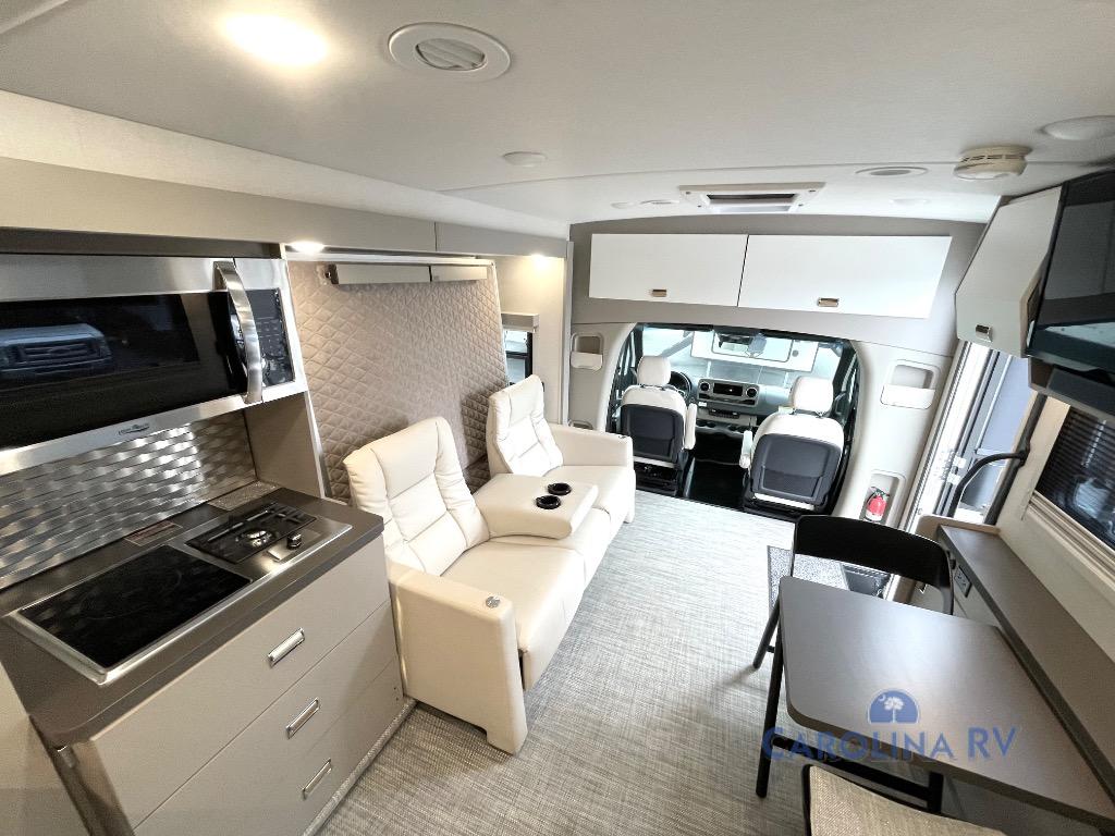 The Winnebago View 24T Class C diesel motorhome is functional, innovative, and stylish! You can rule the interstate with the Mercedes-Benz RWD Sprinter chassis, or choose the optional Mercedes-Benz AWD Sprinter chassis to tackle tougher terrain. A Lithium Power Package comes with a 320-amp-hour lithium battery and a dedicated second alternator that will allow you to charge the batteries faster while you're on the road. There are also two 120-watt solar panels to keep you going when you're off-grid. Since there is a heated gear garage with L-track cargo tie-downs, you can bring along two full-size bikes and additional gear for hiking, plus there are 110V/12V charging ports and LED lighting here for added convenience. The contemporary interior features blackout roller shades for the lounge and dining area, woven vinyl flooring throughout, and dimmable LED lighting. There is also a Winnebago Connect that is integrated into your Winnebago app that acts as your RV companion. Now you can stay informed on vehicle system alerts, travel prep resources, energy management, and more!